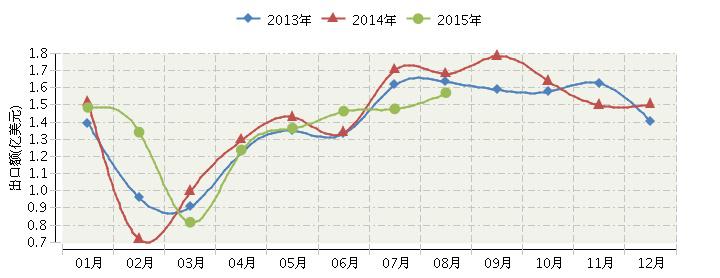 其中:8月份出口额1.57亿美元,同比下降6.13%。