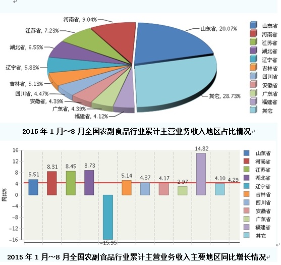 2015年1月~8月,全国农副食品行业完成累计主营业务收入40,369.53亿元,同比增长4.29%。比重主要集中在山东省、河南省、江苏省、湖北省、辽宁省、吉林省、四川省、安徽省、广东省、福建省、其它等地区。其中:山东省完成累计主营业务收入8102.65亿元(占20.07%),同比增长5.51%;河南省完成累计主营业务收入3649.69亿元(占9.04%),同比增长8.31%;江苏省完成累计主营业务收入2920.42亿元(占7.23%),同比增长8.45%;湖北省完成累计主营业务收入2644.08亿元(占6.55%),同比增长8.73%;辽宁省完成累计主营业务收入2373.83亿元(占5.88%),同比增长-15.95%;吉林省完成累计主营业务收入2070.79亿元(占5.13%),同比增长5.14%;四川省完成累计主营业务收入1802.53亿元(占4.47%),同比增长4.37%;安徽省完成累计主营业务收入1771.66亿元(占4.39%),同比增长4.17%;广东省完成累计主营业务收入1771.32亿元(占4.39%),同比增长2.97%;福建省完成累计主营业务收入1664.83亿元(占4.12%),同比增长14.82%;其它完成累计主营业务收入11597.72亿元(占28.73%),同比增长4.1%。