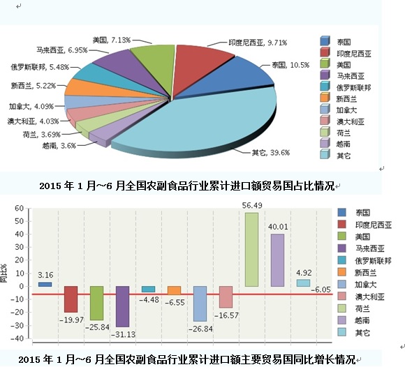 2015年1~6月,全国农副食品行业完成累计进口额146.14亿美元,同比增长-6.05%。比重主要集中在泰国、印度尼西亚、美国、马来西亚、俄罗斯联邦、新西兰、加拿大、澳大利亚、荷兰、越南、其它等地区。