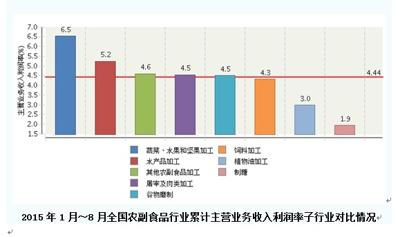 2015年1~8月,全国农副食品行业累计主营业务收入利润率为4.44%,同比增长0.29%。其中,蔬菜、水果和坚果加工累计主营业务收入利润率为6.53%,同比增长0.07%;水产品加工累计主营业务收入利润率为5.23%,同比增长0.17%;其他农副食品加工累计主营业务收入利润率为4.6%,同比增长0.28%;屠宰及肉类加工累计主营业务收入利润率为4.54%,同比增长0.03%;谷物磨制累计主营业务收入利润率为4.5%,同比增长0.01%;饲料加工累计主营业务收入利润率为4.32%,同比增长0.39%;植物油加工累计主营业务收入利润率为2.99%,同比增长0.36%;制糖累计主营业务收入利润率为1.95%,同比增长6.38%。