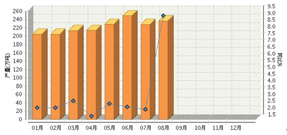根据国家统计局公布数据,2015年1月~8月,全国乳制品行业累计完成产量1,789.75万吨,同比增长3.37%。其中:1月份完成产量204.71万吨,同比增长2.37%;2月份完成产量204.71万吨,同比增长2.37%;3月份完成产量213.33万吨,同比增长2.88%;4月份完成产量213.74万吨,同比增长1.74%;5月份完成产量228.53万吨,同比增长2.68%;6月份完成产量248.81万吨,同比增长2.44%;7月份完成产量228.03万吨,同比增长2.25%;8月份完成产量236.91万吨,同比增长9.15%。