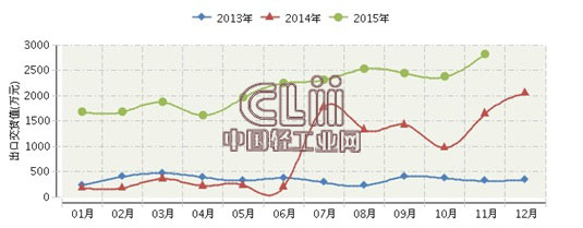2015年山东电光源制造行业连续三年月度出口交货值对比