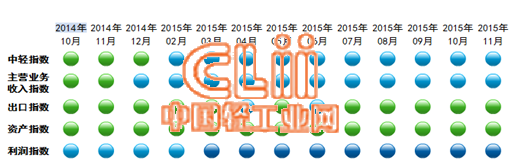 其中:主营业务收入景气指数85.68,出口景气指数98.37,资产景气指数101.66,利润景气指数76.9。与上月相比,资产、利润景气指数稍有回落,其他指数有所回升。其中资产、出口指数位于稳定区间,主营业务收入指数位于渐冷区间,利润指数位于过冷区间。一年间各指数信号灯变化态势参见图1-2所示。