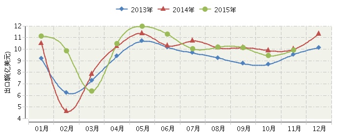 2015年全国文教办公用品行业月度出口额及同比