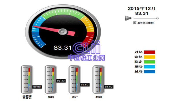 根据 发布的2015年12月中轻农副食品加工行业景气指数,12月份中轻农副食品加工行业景气指数为83.31。处于渐冷区间。具体的分项指数为:主营业务收入景气指数为80.98,出口景气指数为96.33,资产指数为86.52,利润指数为81.02。