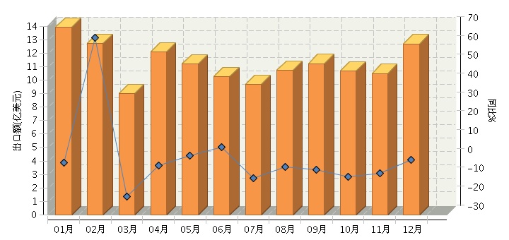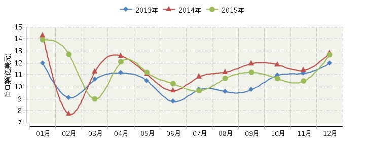 根据海关总署发布数据,2015年1月~12月,全国体育用品行业累计完成出口额134.50亿美元,同比增长-1.74%。其中:1月份完成出口额13.94亿美元,同比增长-2.49%;2月份完成出口额12.73亿美元,同比增长64.13%;3月份完成出口额9.01亿美元,同比增长-20.23%;4月份完成出口额12.1亿美元,同比增长-4.02%;5月份完成出口额11.21亿美元,同比增长1.4%;6月份完成出口额10.28亿美元,同比增长5.9%;7月份完成出口额9.69亿美元,同比增长-10.76%;8月份完成出口额10.71亿美元,同比增长-4.7%;9月份完成出口额11.23亿美元,同比增长-6.09%;10月份完成出口额10.7亿美元,同比增长-9.82%;11月份完成出口额10.5亿美元,同比增长-8.06%;12月份完成出口额12.7亿美元,同比增长-0.95%。2015年全国体育用品月度出口额及同比增长趋势如下图所示。