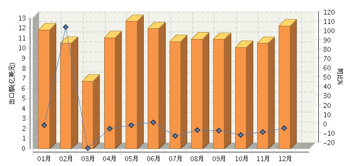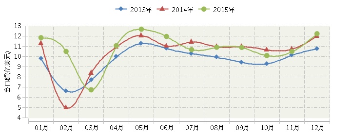 根据海关总署发布数据,2015年1月~12月,全国文教办公用品行业累计完成出口额129.86亿美元,同比增长3.49%。其中:1月份完成出口额11.85亿美元,同比增长4.88%;2月份完成出口额10.49亿美元,同比增长110.28%;3月份完成出口额6.73亿美元,同比增长-19.74%;4月份完成出口额11.06亿美元,同比增长1.16%;5月份完成出口额12.68亿美元,同比增长5.03%;6月份完成出口额11.96亿美元,同比增长8.43%;7月份完成出口额10.67亿美元,同比增长-6.5%;8月份完成出口额10.91亿美元,同比增长-0.42%;9月份完成出口额10.89亿美元,同比增长-0.88%;10月份完成出口额10.09亿美元,同比增长-5.36%;11月份完成出口额10.49亿美元,同比增长-2.22%;12月份完成出口额12.23亿美元,同比增长1.72%。2015年全国文教办公用品月度出口额及同比增长趋势如下图所示。