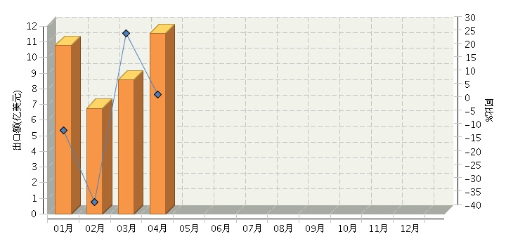 根据海关总署发布数据,2016年1月~4月,全国文教办公用品行业累计完成出口额37.61亿美元,同比下降6.20%。其中:1月份完成出口额10.78亿美元,同比下降8.97%;2月份完成出口额6.75亿美元,同比下降35.61%;3月份完成出口额8.57亿美元,同比增长27.34%;4月份完成出口额11.53亿美元,同比增长4.41%。2016年全国文教办公用品月度出口额及同比增长趋势如下图所示。