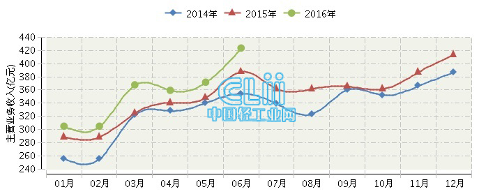2016年全国照明行业连续三年月度主营业务收入对比