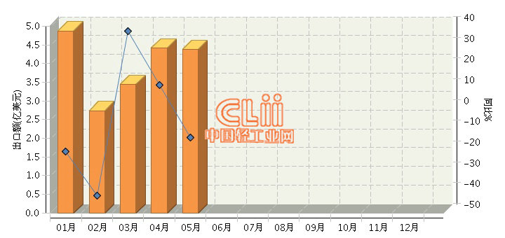 据海关数据显示,2016年1~5月,我国陶瓷制餐具累计出口额同比下降11.21%。其中:5月份出口额4.38亿美元,同比下降13.71%,详见下图: