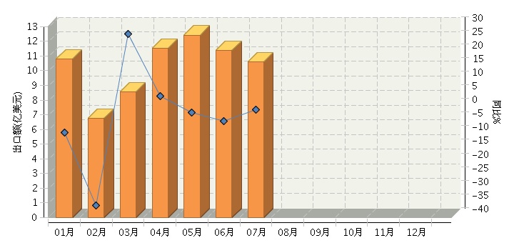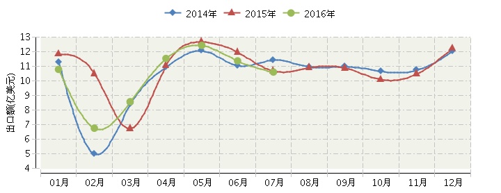 根据海关总署发布数据,2016年1月~7月,全国文教办公用品行业累计完成出口额70.51亿美元,同比下降6.34%。其中:1月份完成出口额10.78亿美元,同比下降8.97%;2月份完成出口额6.75亿美元,同比下降35.61%;3月份完成出口额8.57亿美元,同比增长27.34%;4月份完成出口额11.53亿美元,同比增长4.41%;5月份完成出口额12.43亿美元,同比下降1.63%;6月份完成出口额11.37亿美元,同比下降4.54%;7月份完成出口额10.6亿美元,同比下降0.48%。2016年全国体育用品月度出口额及同比增长趋势如下图所示。