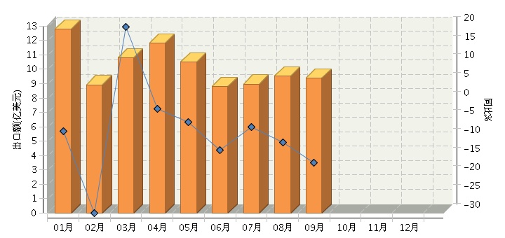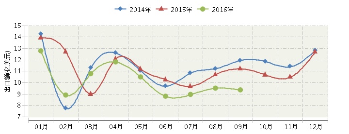 根据海关总署发布数据,2016年1月~9月,全国体育用品行业累计完成出口额90.14亿美元,同比增长-10.40%。其中:1月份完成出口额12.79亿美元,同比增长-8.12%;2月份完成出口额8.91亿美元,同比增长-29.96%;3月份完成出口额10.79亿美元,同比增长19.81%;4月份完成出口额11.82亿美元,同比增长-2.21%;5月份完成出口额10.5亿美元,同比增长-5.74%;6月份完成出口额8.81亿美元,同比增长-13.18%;7月份完成出口额8.97亿美元,同比增长-7%;8月份完成出口额9.52亿美元,同比增长-11.04%;9月份完成出口额9.37亿美元,同比增长-16.57%。2016年全国体育用品月度出口额及同比增长趋势如下图所示。