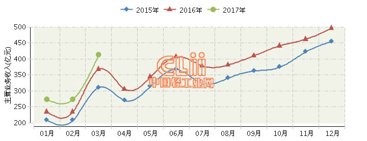 2017年全国陶瓷制品行业连续三年月度主营业务收入对比
