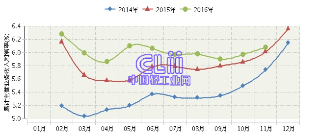 2016年1~11月全国家具行业累计主营业务收入利润率为6.08%
