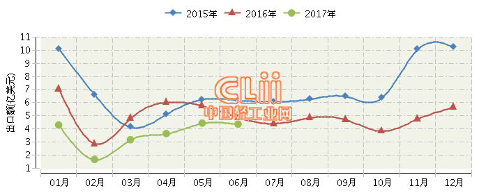 2017年1~6月我国陶瓷砖连续三年月度出口额对比