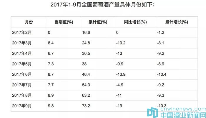 中国作为近几年不能被忽视的葡萄酒产国,2016年产量为11.4亿升。今年的具体预测数据OIV表示截止统计之日还未能确定,但根据国家统计局公布的数据,今年头九个月的葡萄酒产量数值与去年同期相比,均为下降,如下图。