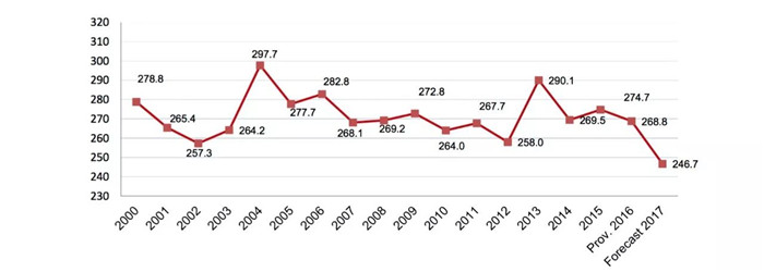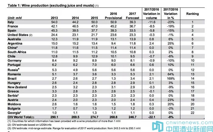 根据国际葡萄与葡萄酒组织(International Organisation of Vine and Wine,OIV)的数据,2017年全球产量预计将比去年下降8.2%,约为246.7亿升,成为五十年来的最低点。准确的说,自上世纪60年代起,就没有出现过比这个更低的数字了。唯一接近的数字是1991年的251.6亿升和1994年的249.4亿升。
