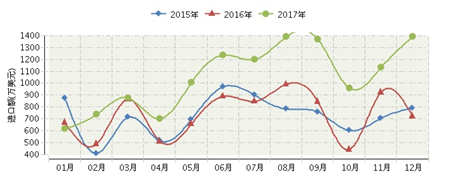 2017年我国陶瓷砖进口量价同比双增长。据海关数据显示,2017年1~12月我国陶瓷砖累计进口金额1.26亿美元,同比增长42.21%;进口量606.11万平方米,同比增长23.76%。从连续三年月度进口额对比情况看,2017年除1月份,其他各月进口额均高于上两年水平,其中5~12月(除9月份之外)进口额均在1000万美元以上,12月进口额1393.14万美元,为全年单月最高