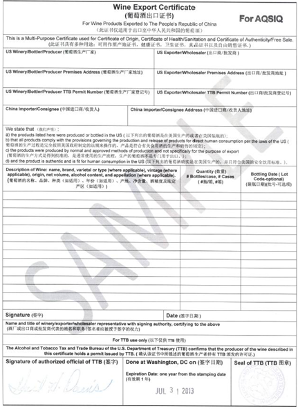 记者从国家质检总局获悉,经海关总署、质检总局与美国政府有关主管部门磋商达成一致,自2014年3月1日起,美国财政部烟酒税收贸易局将启用美国输华《葡萄酒出口证书》,作为美国输华葡萄酒的唯官方证书,不再签发目前的美国输华葡萄酒原产地证书、健康证书、卫生证书、真品证书及自由销售证书等证书。