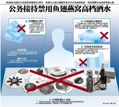 “今后公务接待不得提供鱼翅、燕窝等高档菜肴,不得提供香烟和高档酒水,不得使用会所、高档餐饮场所。”近日,中共中央办公厅、国务院办公厅印发了《党政机关国内公务接待管理规定》,要求各地区各部门遵照执行。