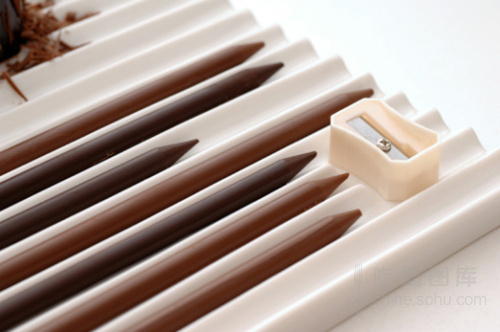 Nendo让这个幻想成真了,毕竟他来自拥有哆啦A梦的日本。他和一家点心店合作进行餐具设计,将不同颜色深度的巧克力棒做成铅笔形状,并且配备了一个卷笔刀,和削铅笔一样把刨屑撒在点心上,做成这个巧克力铅笔(chocolate-pencils)。这一个小设计,尽显日本点心的精致和人文情怀。