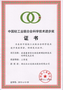 3月28日, 三届四次理事会暨全国 工作座谈会在济南召开。会议对2013年度中国轻工业科技项目进行了表彰,白云边酒业的“浓酱兼香型白酒发酵调控新技术的研究及应用”项目荣获 科技进步三等奖。