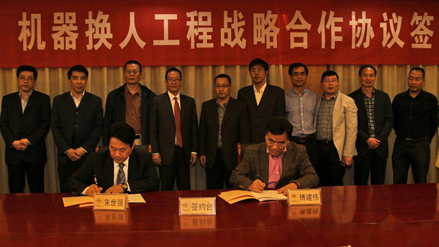 5月6日,浙江古越龙山绍兴酒股份有限公司与浙江大学机器人研究中心就黄酒生产领域协作推进“机器换人”工程,达成战略合作框架协议:双方用3~5年时间,通过实施系列化的“机器换人”和升级改造,使体力劳动用工量降低50%以上,生产环节的物流成本降低20%以上,同等生产规模的仓储空间需求降低30%以上。