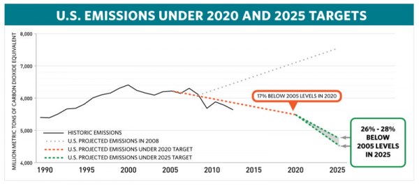 奥巴马总统就职之初,承诺美国在2020年以前减排17%,此时承诺在2025年提高到28%,几乎增加一倍。