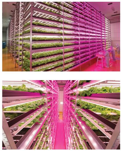 图4. 顶图显示在Hubbell Lighting公司的NutriLED照明下,植物茁壮成长;而其他三图显示城市莴苣农场采用GE日本公司开发的LED灯具,在受控环境中提高产量。
