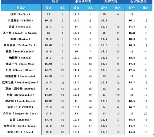 而当中最引人注目的“中国进口葡萄酒品牌TOP20”排名,则是综合候选品牌的市场占有率、品牌国际性(行业成熟度)、品牌稳定性、品牌发展趋势、市场属性、品牌支持、终端支持等多重权重指标进行审核,并由专业人士进行打分,最后结合网上投票评选出来的。最终,拉菲(Lafite)、卡思黛乐(CASTEL)、奔富(Penfolds)、杰卡斯(Jacob s Creek)、木桐(Mouton)等入选中国进口葡萄酒品牌TOP20。