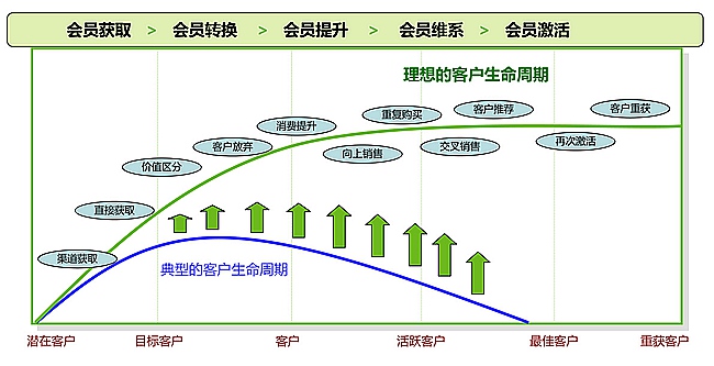 会员卡意味着什么?在大多数商家眼里,仅仅是得到顾客联系方式的工具,作用只是发送促销信息,积分兑换,甚至仅仅是因为旁边店在做“会员制”。下面就是理想客户生命周期与典型客户生命周期的差别: