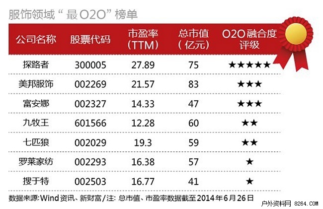 商务部的统计数据显示,2013年,中国网络购物市场交易规模达1.85万亿元,占社会消费品零售总额的比重达7.8%。服饰作为网购渠道的核心品类,自然也搭上了高速增长的快车。2013年是服饰企业试水O2O元年,越来越多的传统品牌在O2O创新上有了实质性的推进。A股服饰企业中,探路者、美邦服饰、富安娜等走在了前面。