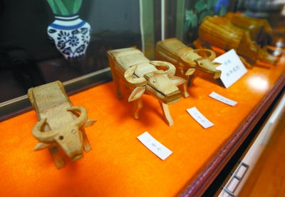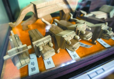 冯乐耘设计制作的榫卯雄狮、公鸡、水牛玩具。