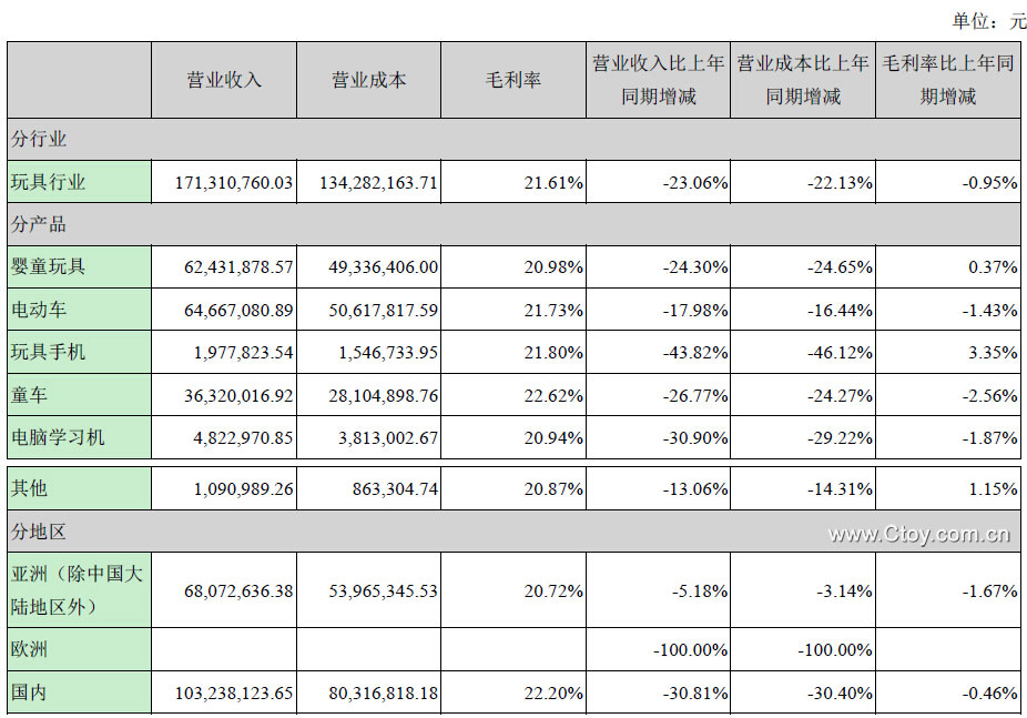 但中外玩具网记者发现,今年上半年,群兴玩具旗下婴童玩具、电动车、玩具手机、童车、电脑学习机等系列产品营收全新下降。尽管群兴玩具在中报强调,面对国际市场不景气的背景下,经济下行压力依然较大情况下,公司适度调整营销策略,进一步提高国内市场占有率,积极开拓国内市场,但显然,国内玩具市场激烈的竞争令群兴玩具在国内市场面临极大挑战。