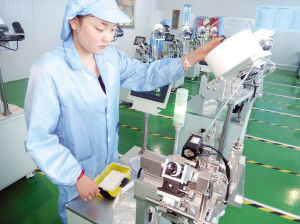 位于滨海工业区的绍兴华晶科技有限公司的封闭式生产车间,一位工作人员正在对打磨出炉的陶瓷插芯做自动化检测。华晶科技公司凭借自主研发的陶瓷插芯技术,从最初日产五六万粒陶瓷插芯,扩大到目前日产20万粒,仍供不应求。
