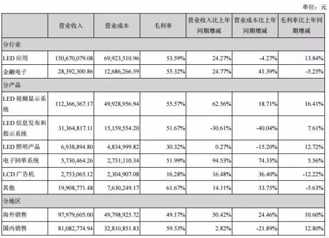其中LED方面,奥拓电子表示,公司继续在LED应用行业采取大市场营销战略,加强国内外营销服务平台的建设,集中资源在新的高密度LED显示产品市场进行拓展,尤其在户外高密度LED应用市场引领行业。报告期内,LED应用产品销售增长较快,产品应用到2016欧洲杯比赛和球迷公园,为美国CBS电视台的亚特拉大NCAA演播厅提供LED显示解决方案,实施了大众汽车发布会等项目。2016上半年LED应用上实现营收150,670,079.08元,同比增加24.27%。而LED视频显示系统销售收入与去年同期相比更是增长62.56%;其中海外销售收入增长55.88%。