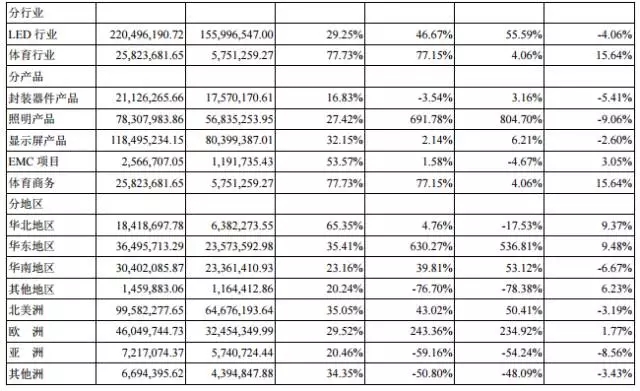 据公告显示,报告期内,2016年上半年,公司国际市场开拓顺利及体育资源的效益增长,实现营业总收入25,071.8万元,同比增长49.41%,其中:体育资源的销售收入同比增长1,124.6万元,照明产品销售收入同比增长6,841.8万元,显示屏国际销售收入同比增长248.2万元。