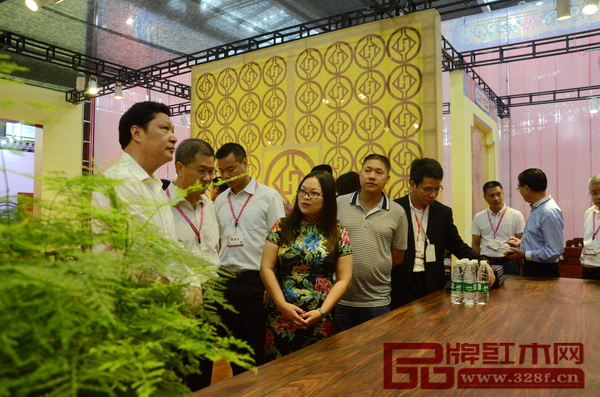 孔连红木总经理李宏志(左四)向深圳市龙华新区党工委书记余新国(左一)介绍孔连红木的发展历程