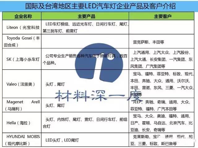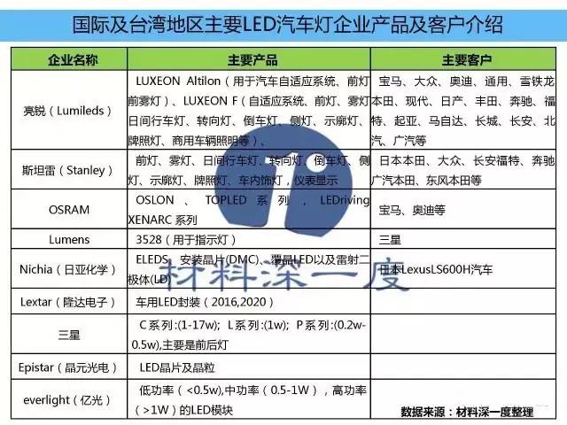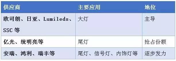 由于车用LED对于芯片功率及可靠性要求较高,且国际主要芯片及封装大厂的提前布局,所以目前市场上车用LED芯片厂商主要以Lumileds、欧司朗、日亚化学等为主,特别是用于汽车前照灯的大功率芯片。