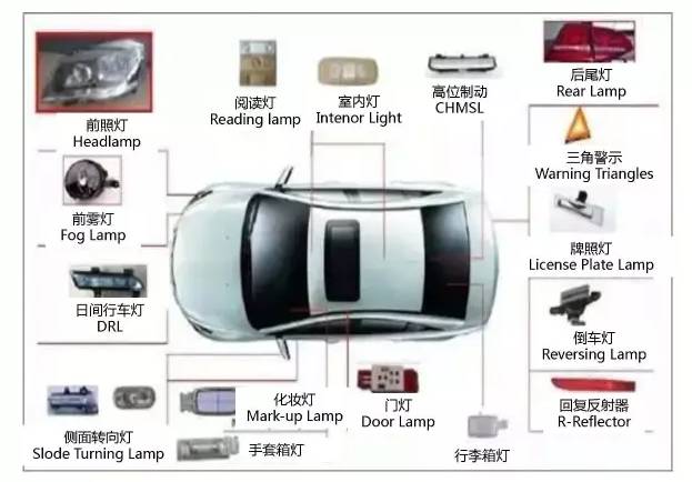 汽车照明主要包括汽车照明灯具(前照灯、雾灯、牌照灯、仪表灯、顶灯、工作灯等)和汽车信号灯具(转向灯、报警灯、示宽灯、尾灯、制动灯、倒车灯等)。
