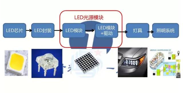 LED汽车照明产业链包括芯片、封装、模块、灯具、照明系统五个部分。