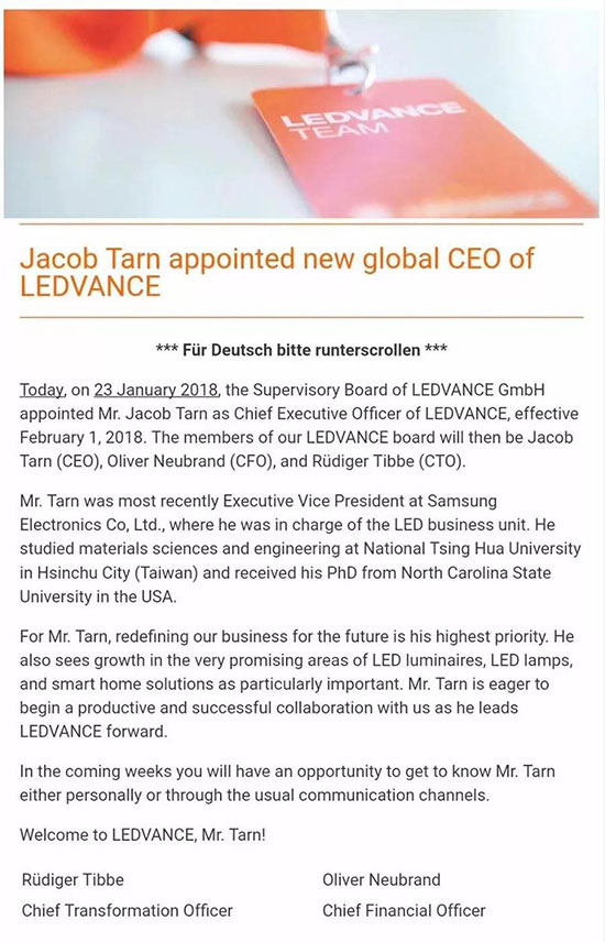 朗德万斯监理会暂定他于2018年2月1日在德国加兴全球总部就职,就职后谭昌琳博士将专注于加速公司从传统的灯具制造商转型为行业领先的创新驱动型LED照明公司。
