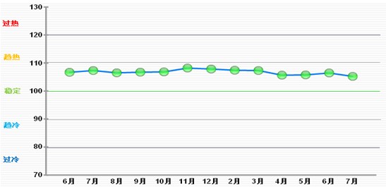 7月份中轻景气指数为105.23,位于“稳定”区域,体现了当前我国轻工业整体发展较为平稳的状态。与6月相比,中轻景气指数有小幅回落。