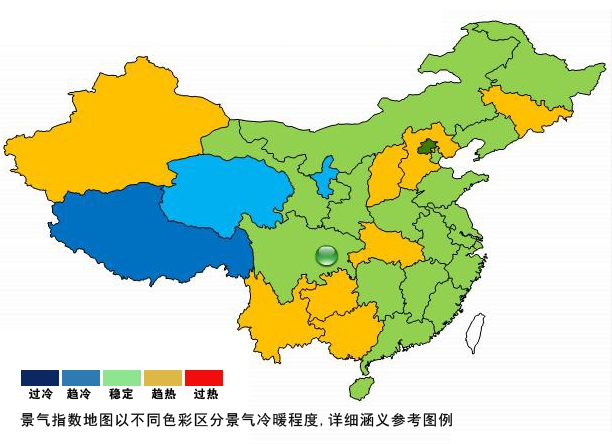 2011年7月份中轻景气指数地图显示,全国大多数省市自治区 发展处于稳定区间,部分地区发展趋热,如吉林、河北、山西、湖北等省份景气指数分别达到112.06、110.89、117.93和113.50,山东、广东、浙江等地区中轻景气指数保持稳定,分别为103.17、104.36和98.39。与6月份相比,山西、海南、贵州等地区发展过热势头得到部分缓解。