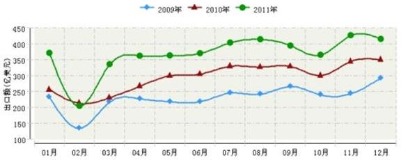 图5-2 2009~2011中国轻工全行业连续三年出口额月度走势对比图