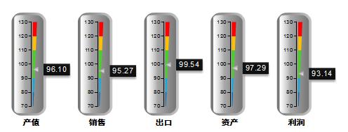 从分指标运行指数来看,2012年12月中轻产值景气指数96.10(上月 95.35)、销售景气指数为95.27(上月96.12)、出口景气指数99.54(上月102.00)、资产景气指数97.29(上月97.77)、利润景气指数93.14(上月 93.13)。除产值景气指数以外,其他分项指标景气指数均有所下降。