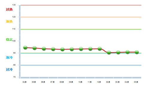 5月份中轻景气指数为90.75,位于“稳定”区域,环比下降0.09点,同比下降3.44点(参见图1-1)。
