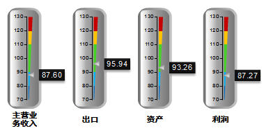 从分指标运行指数来看,利润景气指数较去年年末回升4.27点达到87.27,其他各项分项指数均较上月有不同程度下降,其中:出口景气指数95.94,较上月下降1.4点,主营业务指数87.60,较上月下降1.22点,资产景气指数93.26较上月下降1.98点。