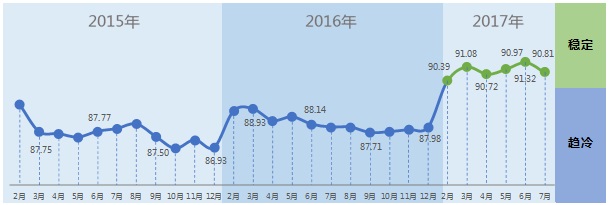 中国轻工业经济运行及预测预警系统数据显示:2017年以来,中轻景气指数自今年年初重回绿色“稳定”区间,并持续在稳定区间震荡运行,说明今年以来,轻工业经济运行有企稳回暖态势。7月,中轻景气指数为90.81,较上月小幅下降0.51点。