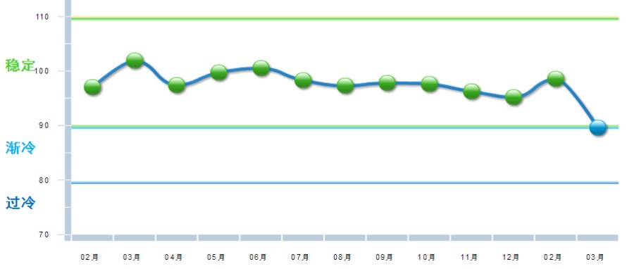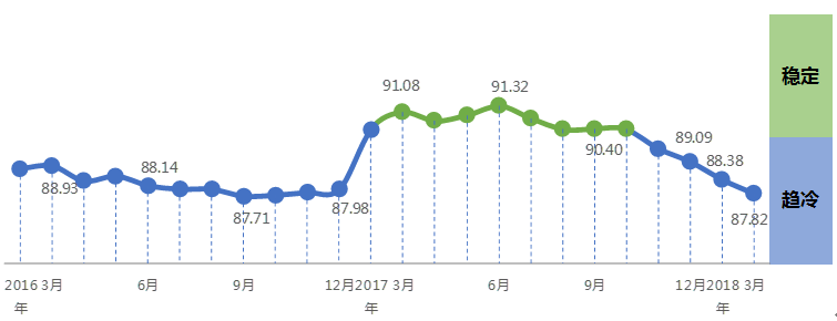 中国轻工业经济运行及预测预警系统数据显示:2018年开年,中轻景气指数延续去年四季度以来的下降态势,连续4个月在蓝色“趋冷”区间逐月下行,3月中轻景气指数为87.82,环比2月继续下降0.56点。